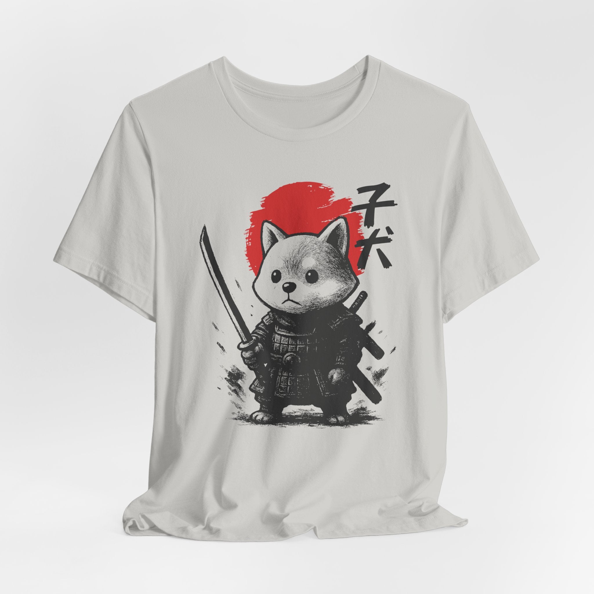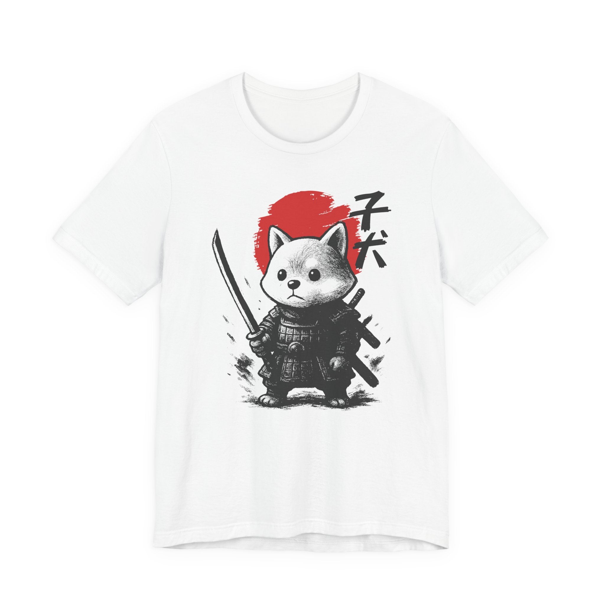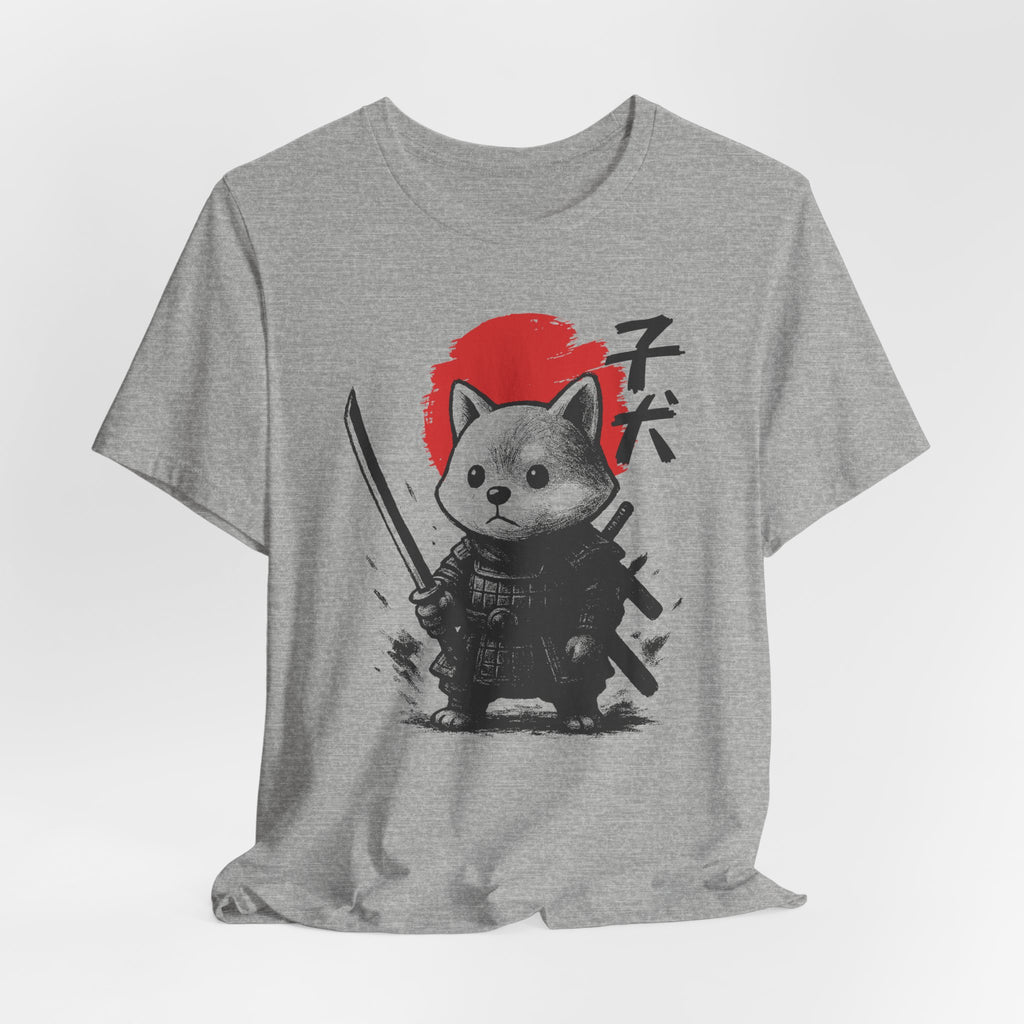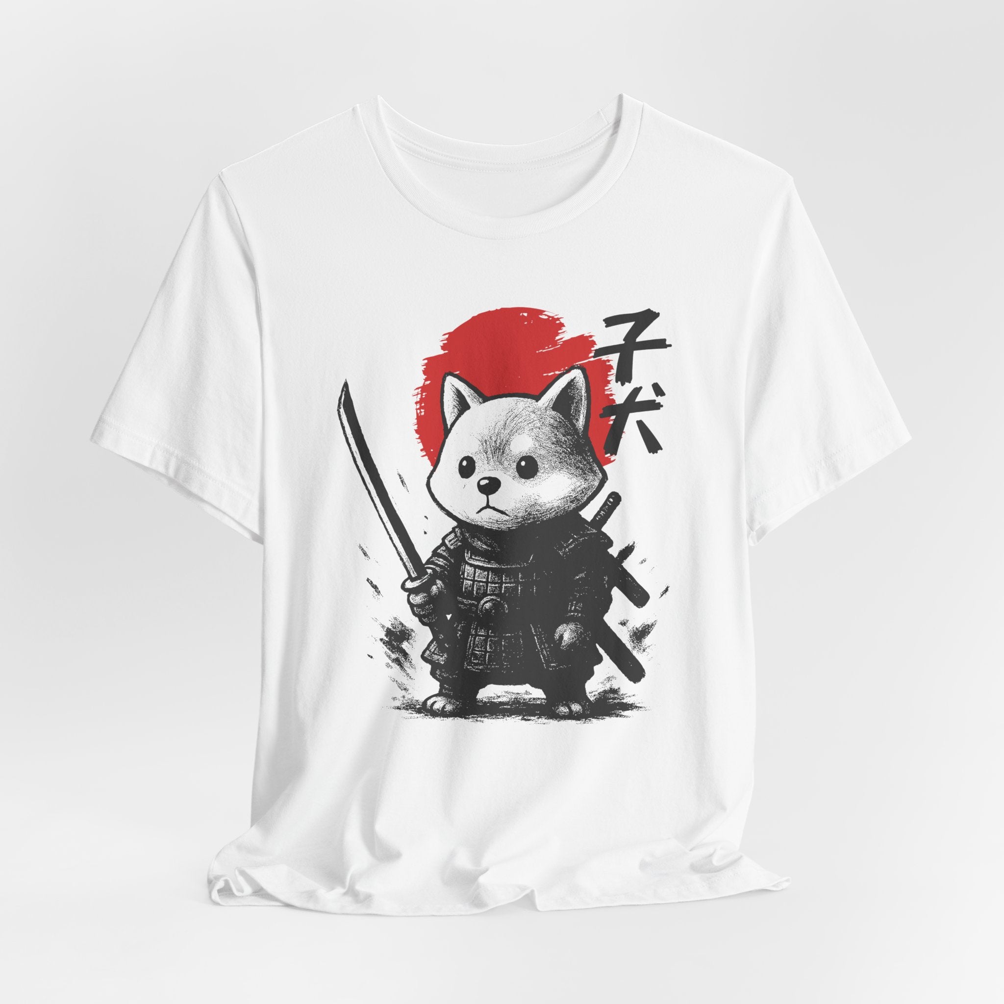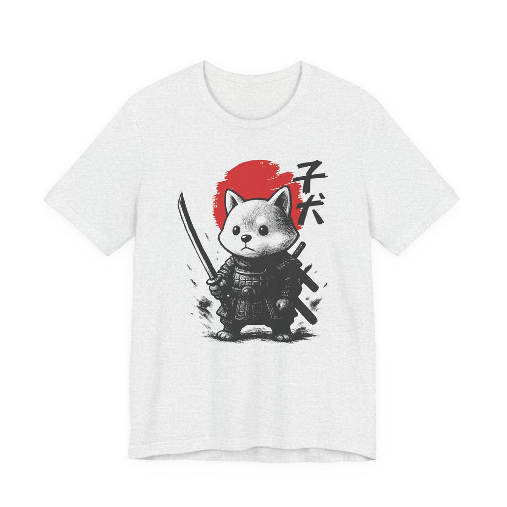 A lightweight, breathable tee that brings playful samurai charm to everyday wear. The front shows a detailed, ink-style illustration of Baby Doge in samurai armor set against a bold red sun — a balance of cute and fierce that reads both modern and timeless. Soft Airlume combed cotton and a retail crew neckline keep the fit clean and comfortable for layering or standing alone. Wear it to express quiet confidence, whether you’re roaming city streets, meeting friends at a cafe, or settling in for a relaxed game night.